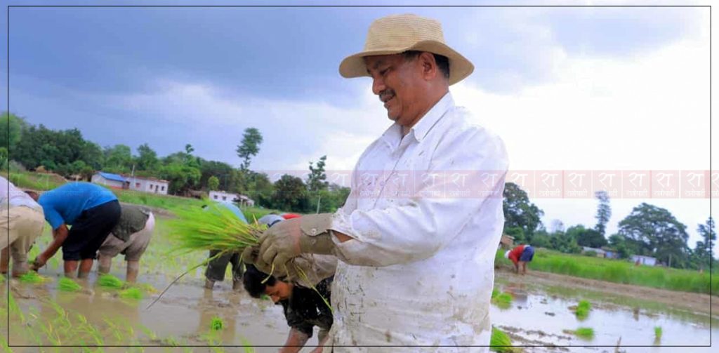एकीकृत समाजवादी क्रान्तिसँगसँगै उत्पादन नीतिलाई अवलम्बन गरी आत्मनिर्भर अर्थतन्त्र निर्माणमा लागेको नेपाल कम्युनिस्ट पार्टी (नेकपा)का महासचिव नेत्रविक्रम चन्द ‘विप्लव’ यतिवेला कपिलवस्तुमा धान रोपाइँमा व्यस्त छन् । केन्द्रीय नेतृत्वदेखि स्थानीय समितिसम्म अनिवार्य श्रममा जोडिने पार्टी नीति अनुसार नेकपाले असार १० गतेदेखि साउन १० गतेसम्म एक महिने उत्पादन अभियान सञ्चालन गरेको छ ।